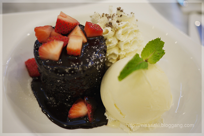 ช๊อฟช็อคโกแลตบราวนี่ ราดด้วยช็อคโกแลตเข้มข้น แต่งด้วยสตรอเบอรี่สด และ ไอติมวนิลา วีปครีม