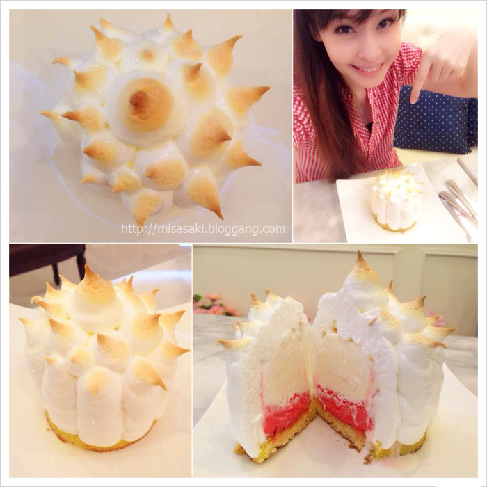 ไอติมราสเบอรี่เชอเบท + ไอติมสตรอเบอรี่ชีสเค้ก วางบน ไวท์ช็อโกแลตสปองเค้ก คลุมด้วยอิตาเลี่ยนเมอแรงก์