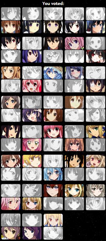 ผลรอบก่อนรายงานไปแล้ว ก็โหวตเลยละกันครับ (นอกสถานที่ รีบหนอย ไม่ได้ทำตาราง SDO ให้ ดูข้างล่างเอานะครับ) http://internationalsaimoe.com/statistics/amethyst/ Shana (85) Rikka (71) Misaka (61) Hime (86)