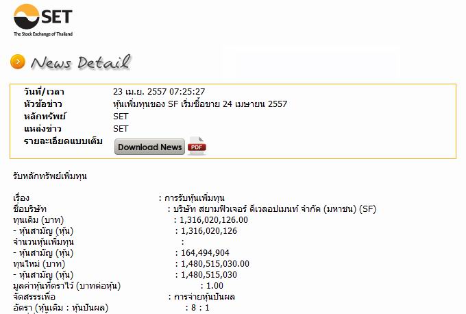 SF : หุ้นปันผลเข้าพอร์ตแล้ว ใครอยากขายเริ่มขายได้ 24/4/2557