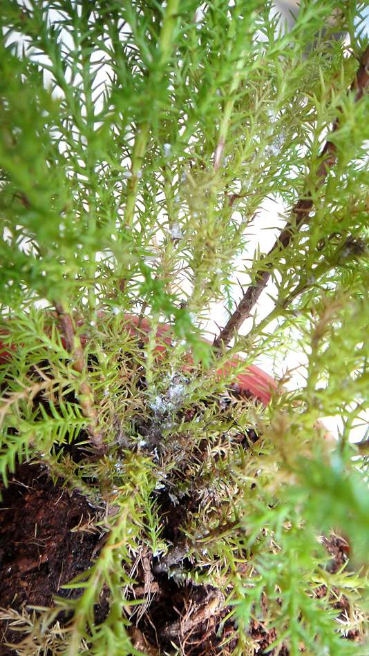 เนื่องจากเอามาเลี้ยงได้ 4 เดือนแล้ว ใบบางส่วนเริ่มแห้งจนต้องตัดทิ้งไปเยอะ และโคนต้นมีขาวๆมาเกาะ ครับ