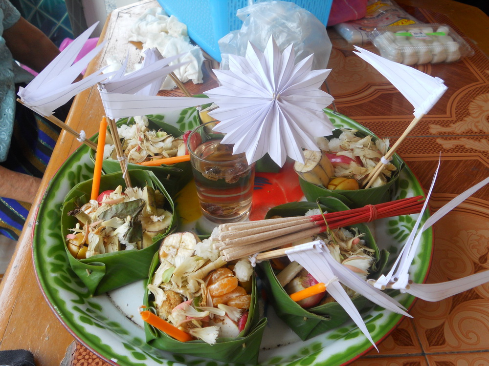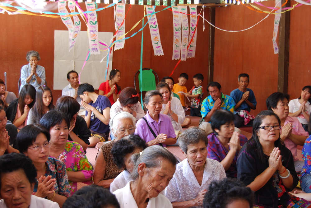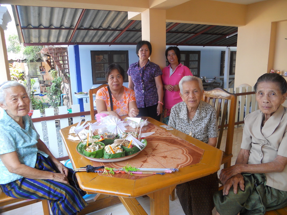 โดยมีผู้เฒ่าผู้แก่มาจัดข้าวตอกดอกไม้เตรียมงานบุญ