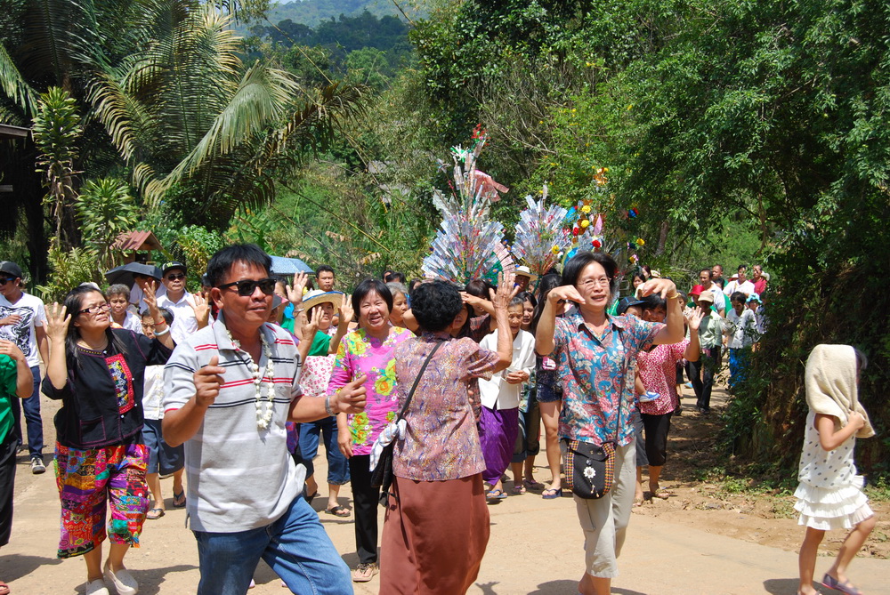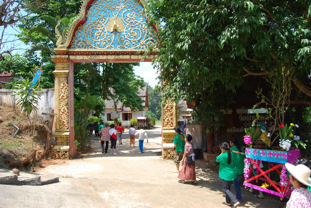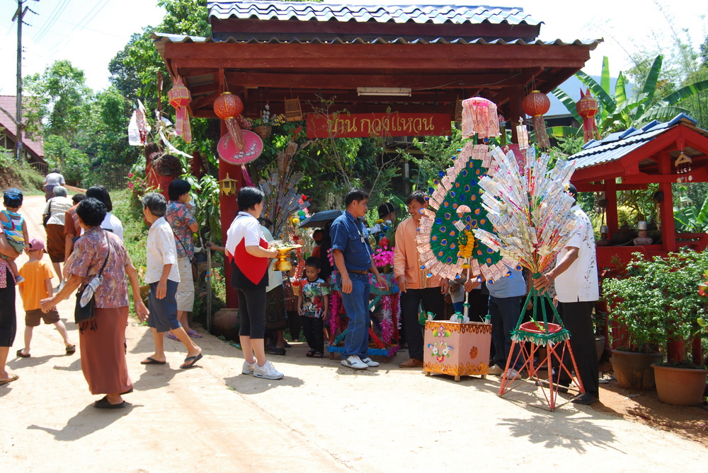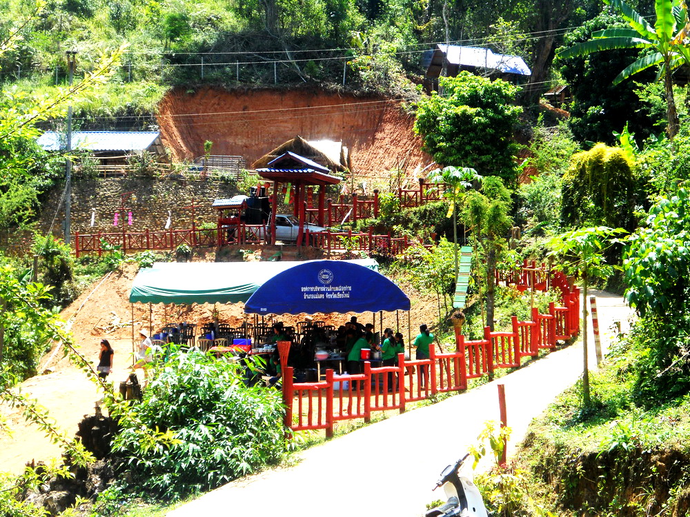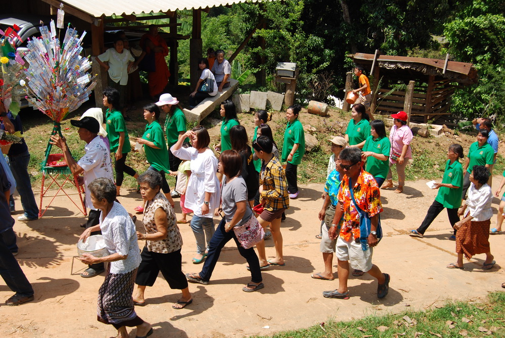 แวะตั้งขบวนที่บ้านญาติ.ลุงน้อยก่อนที่จะเดินทางไปที่วัด...โดยมีชาวบ้านให้การต้อนรับด้วยอาหารกลางวันสุดอร่อย..ก่อนจะเริ่มขบวนเดินเท้าขึ้นวัด..รถยนต์ขึ้นลำบากเพราะทางชันมาก..