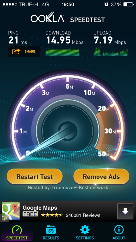 พอดีเมื่อวานไปเปลี่ยนซิม เป็น 4G ที่ทรูชอปมา ถามพนักงานที่ชอป บอกว่าแถวอ่อนนุช รับ 4G ยังไม่ได้ พอมาวันนี้ขึ้น โลโก้ ซะงั้น เลยลองเทสดู ความเร็วตามรูปอ่ะครับ เทสหน้าโลตัสอ่อนนุช ก็โอเคนะ เร็วกว่าใช้ ทรู 3G. เป็นไหนๆ แต่แถวอโศกเร็วกว่านี้ครับ