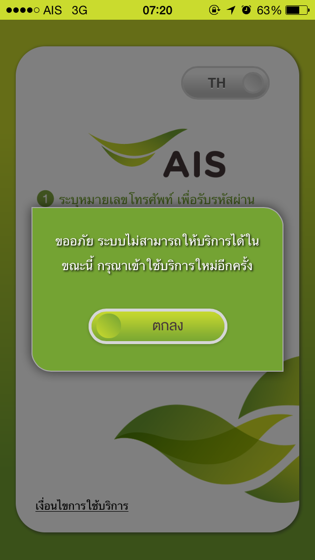 ลองใส่หมายเลขโทรศัพท์แล้วกดปุ่มรับรหัสผ่าน แต่มีข้อความแจ้งว่า "ขออภัยค่ะ ระบบไม่สามารถให้บริการได้ในขณะนี้" ครับ