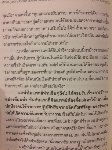 แต่เนื่องจากหนังสือนี้ชักจูงอย่างมากเรื่องประโยชน์ของอาหารเสริม ในบทท้ายๆ จึงมีการให้ข้อมูลว่า หากจะต้องการได้รับวิตามินหรือสารอาหารเหล่านี้ในปริมาณที่เหมาะสมจะต้องกินอาหารปกติจำนวนสูงเว่อร์ เพื่อให้เห็นว่าควรกินอาหารเสริม เช่นหากต้องการวิตามินD ในปริมาณที่ควรจะได้รับต่อวันจะต้องกินไข่แดงวันละ 22ฟอง หรืออยากได้วิตามินCในปริมาณที่ควรได้รับต่อวันจะต้องกินส้ม16ผล เป็นต้น สรุปคือ แนะนำว่าต้องมากินวิตามินเสริมเพื่อให้ได้สารอาหารเพียงพออ่ะว่างั้น ซึ่งเราไม่สามารถไปพิสูจน์ความถูกต้องของข้อมูลที่ผู้เขียนบอกนี้ได้ ดังนั้นเรายังไม่เชื่อเพราะเป็นแค่อ่านจากที่เขาเขียนซึ่งอาจจะเป็นเพียงการให้ข้อมูลด้านเดียว