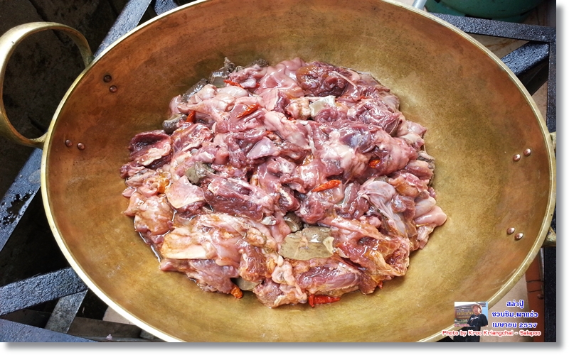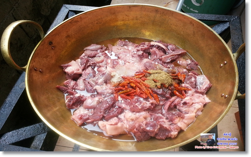 เป็นเมนูที่ทำง่ายมาก ไม่ค่อยมีพิธีรีตรองอะไร เอาเนื้อลงกระทะ ใส่เกลือเม็ด ขมิ้นผง