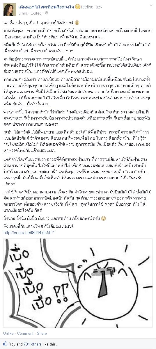 อยากให้ยิ่งลักษณ์ ไปต่ออีกหน่อย เพื่อประเทศ เพื่อประชาธิปไตย ปฎิรูปพรรค เพื่อไทย แบบ โฉมใหม่เลย รับการเลือกตั้ง วางรากฐาน ให้เป็นพรรคของมวลชนจริงๆ ให้เลือกกกรมการบริหาร , primary vote เลือกคนที่ประช