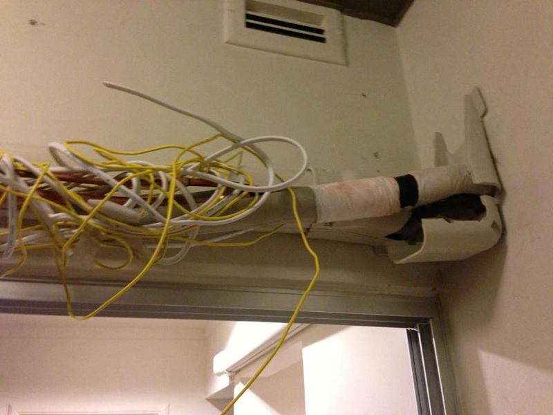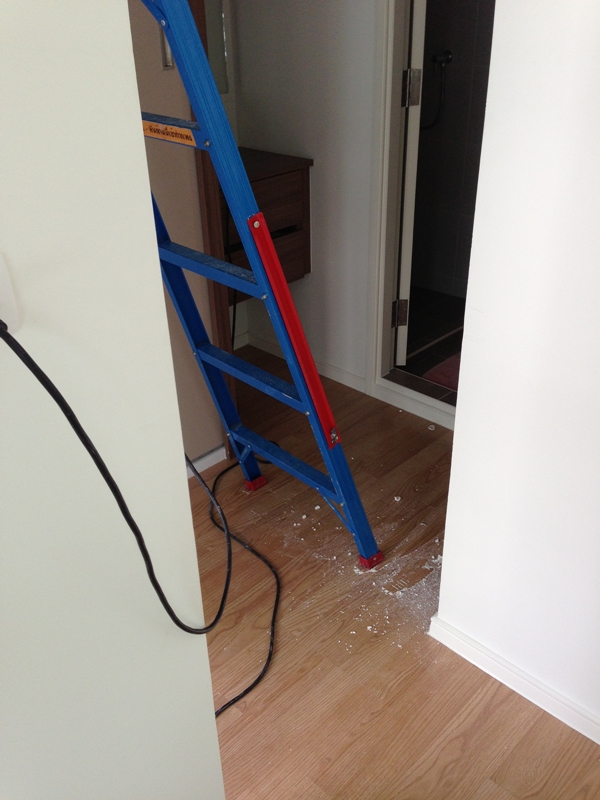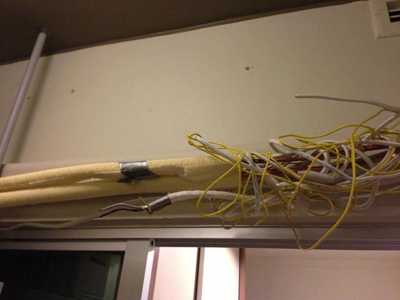 สิ่งที่สาม มาทำงานติดตั้งโดยต้องรู้อยู่แล้วว่ามีการเจาะ การตอก ก็ตามภาพครับไม่มีอะไรมารองซักอย่าง ไม่ว่าจะผ้าใบ หรือ อะไรก็ตาม ของตกที สะเทือนใจเหมือนดูหนังผีตามไปด้วย