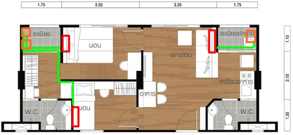 สี่เหลี่ยมสีแดงคือตำแหน่งแอร์, สีส้มคือตำแหน่งคอมเพรซเซอร์ และ สีเขียวคือทางเดินของท่อแอร์ครับ