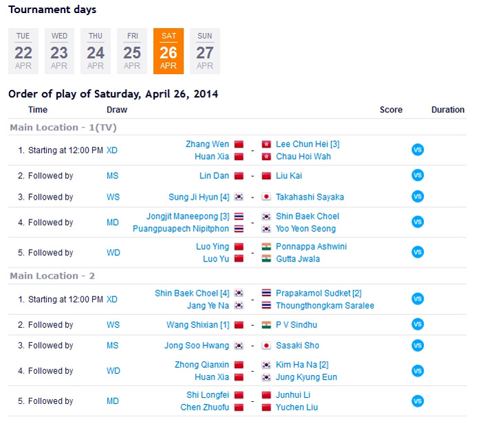 โปรแกรมการแข่งขันของนักกีฬาไทย 26 เม.ย. 2014 รอบรองชนะเลิศ