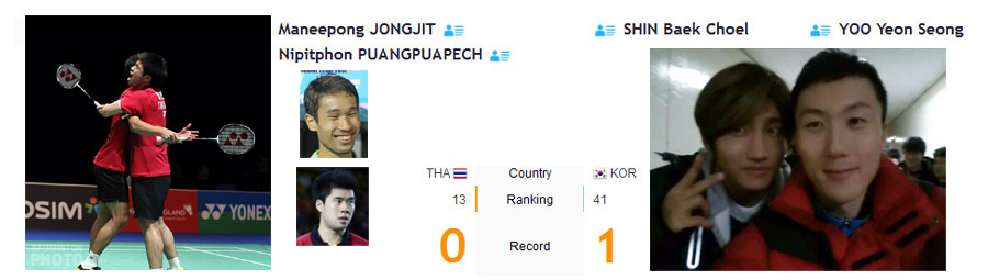 พี่เอ มณีพงษ์-ต้นน้ำ vs Shin Baek Choel-Yoo Yeon Seong (Korea) แข่งคู่ที่ 4 โดยคู่แรก แข่งประมาณ 10.00 น. (คอร์ท 1 TV)