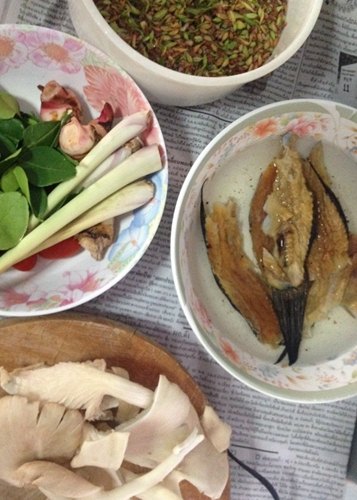 ข่า ตะไคร้ ใบมะกรูด มะเขือเทศ กระเทียม หอมแดง เห็ดฟาง ใบโหระพา