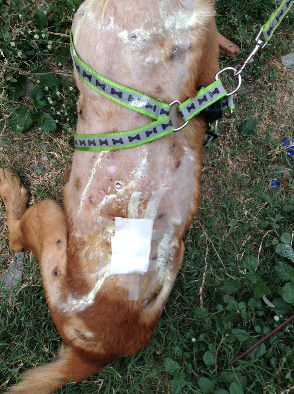 นี่คือหลังจากพาไปหาหมอมาแล้วค่ะ ตรงผ้ากอชแปะไว้คือแผลใหญ่สุดค่ะ
