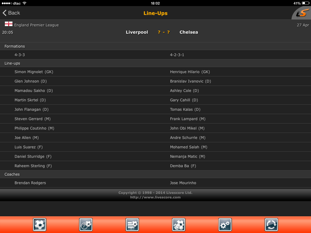 Line up Liverpool : Mignolet, Johnson, Flanagan, Skrtel, Sakho, Gerrard, Allen, Lucas, Coutinho, Sterling, Suarez. Sub : Jones, Toure, Agger, Cissokho, Alberto, Aspas, Sturridge. Chelsea : Schwarz