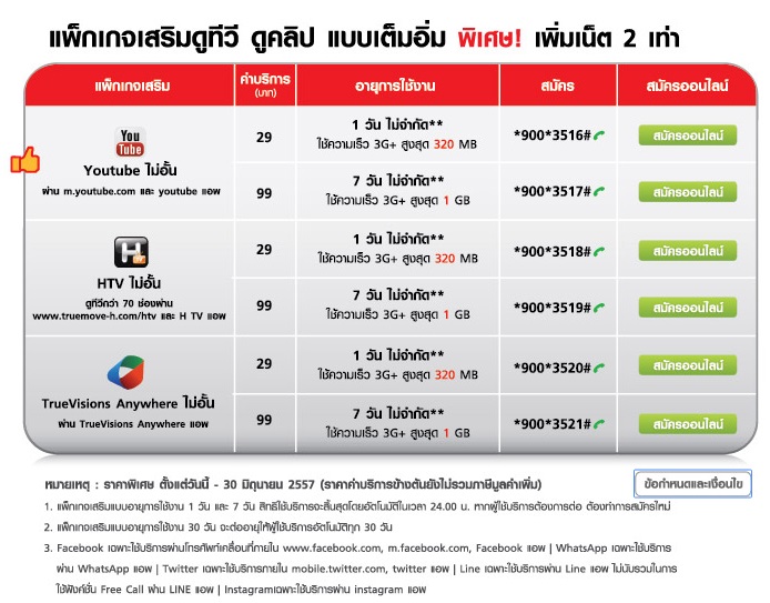 - แพคเกจเสริม youtube ไม่อั้น (โปรโมชั่นในช่วงนี้ จะได้รับอินเตอร์เนทเพิ่มอีก 1 เท่า จนถึงวันที่ 30 มิย. 57)