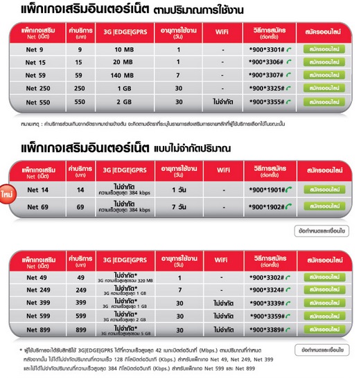 - แพคเกจเสริมอินเตอร์เนท แบบไม่จำกัดปริมาณ