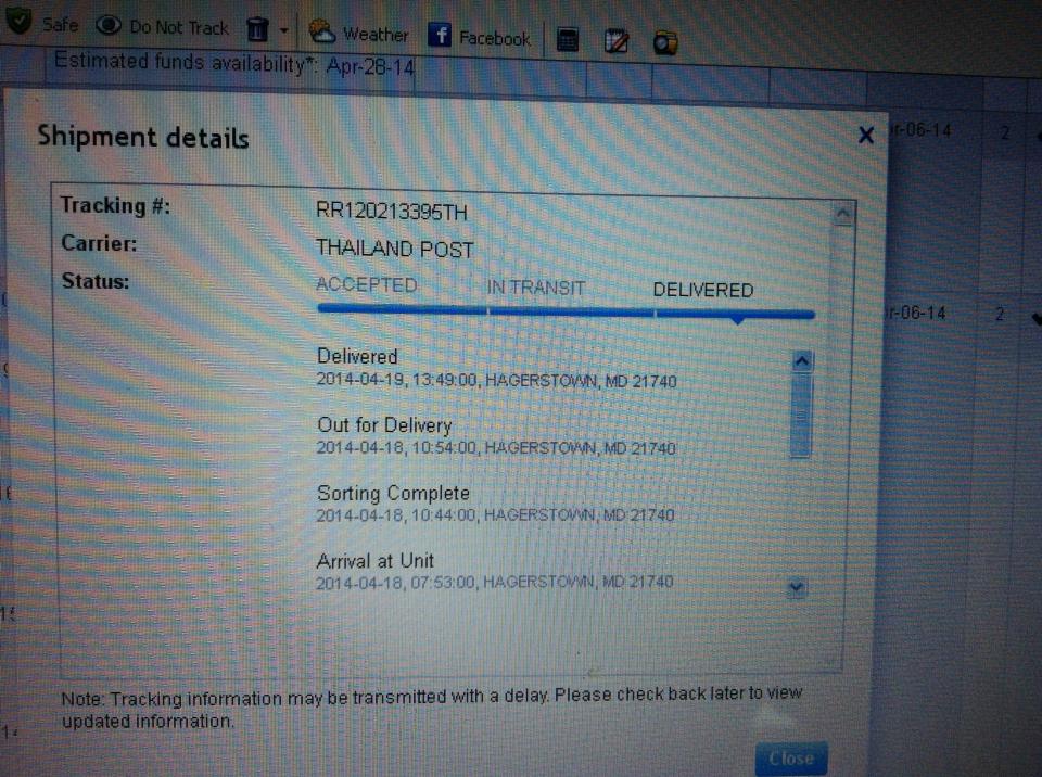 พอผมเช็คใน USPS ปรากฎว่าของได้รับเรียบร้อยแล้ว เมื่อวันที่ 19/04/2014 (วันเดียวกับที่เค้าอีเมล์มาบอกว่าไม่ได้รับ)