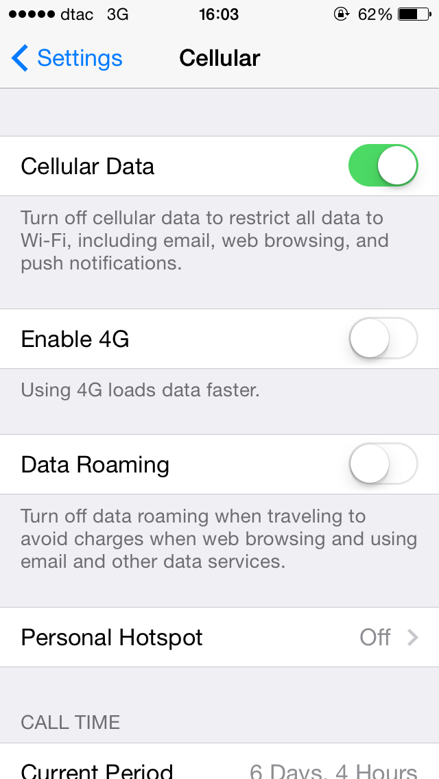 ผมเพิ่งเจอวันนี้ลองกด Settings > General > About มีแจ้งอัพเดต DTAC Carrier Update v16.1 หลังจากอัพเดตเสร็จแล้ว ผมลองเข้าไปที่เมนู Cellular พบว่า ปุ่มสลับ 3G กลายเป็นปุ่ม 4G แล้ว ก็หมายความว่า DT