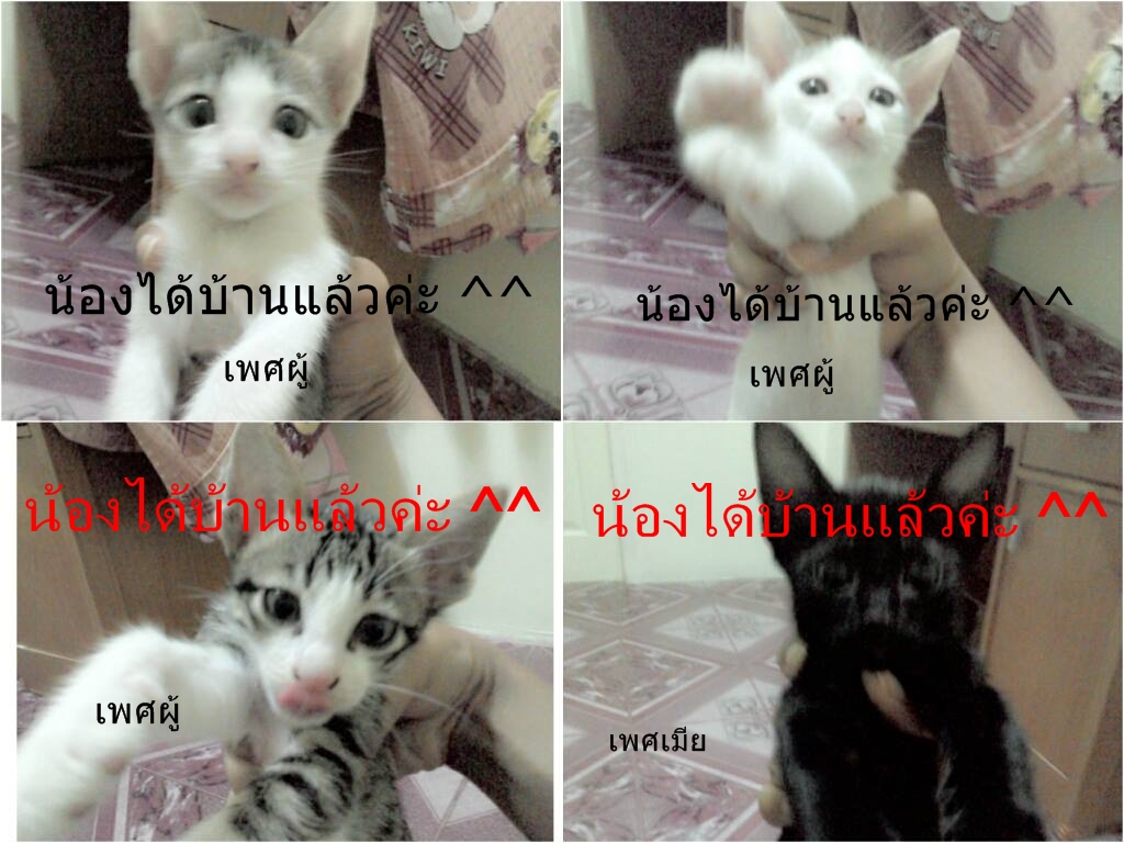 น้องได้บ้านแล้วนะคะ ทั้ง4 ตัว ดีใจมากๆ ขอบคุณทุกท่านที่เมตตากับน้องแมวค่ะ ขอบคุณมากจริงๆ