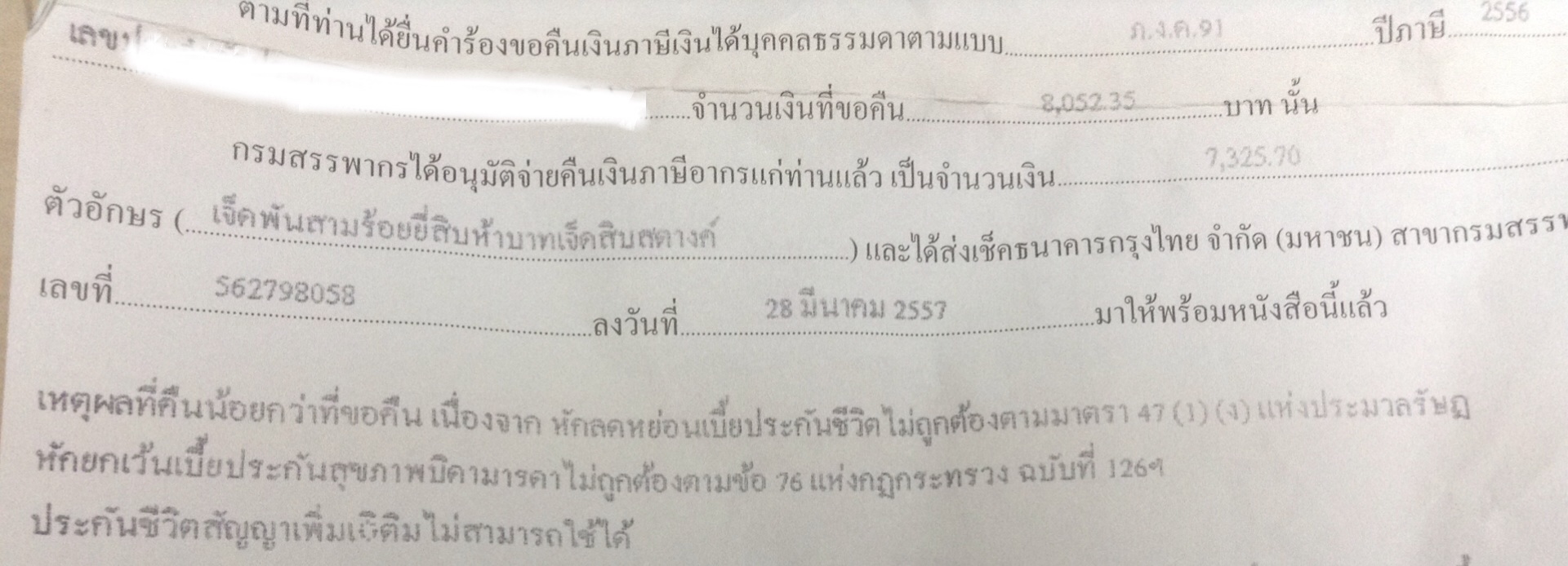 ขอคืน 8052.35 บาท. ได้คืน 7325.70 บาท. เหตุผลตาม กฎหมายข้างต้น