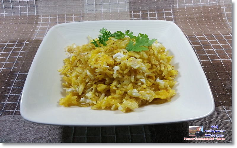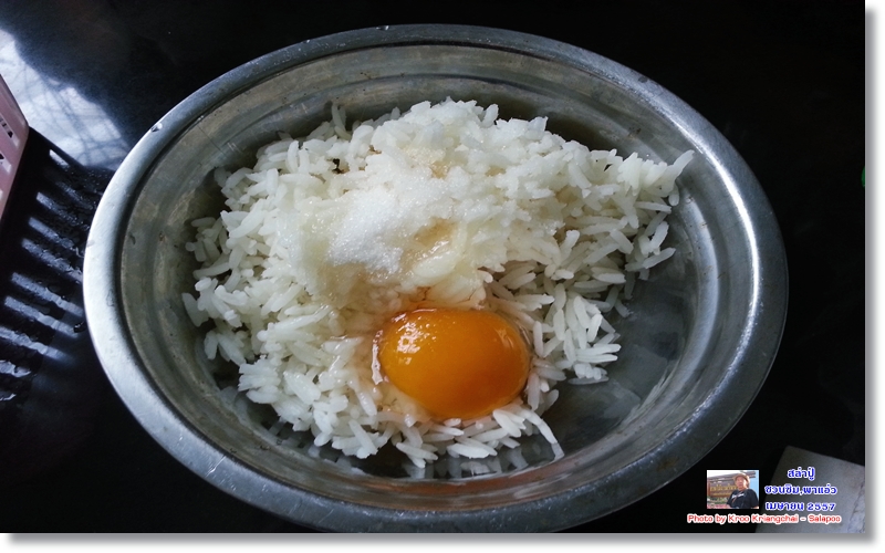 ข้าวสวย เกลือ น้ำตาลทราย ไข่ 1 ฟอง คลุก ทั้งหมดให้เข้ากัน ย้อมสีข้าวให้เหลืองสวย