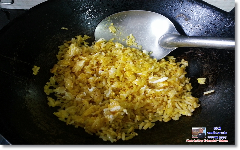 ใส่ไข่ฟองที่ 2 ลงไป ยี ๆ เอาข้าวกลบให้ไข่สุก คนให้เข้ากัน