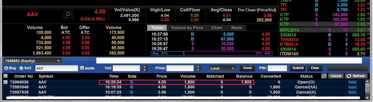 ใครดูไม่ทันว่า AAV วันนี้ปิด ATC อย่างไร Trans ก่อนปิด 16:29:58 Buy 1,000,000 หุ้น ที่ 6.20 บาท สังเกตช่วง ATC ว่า มี Bid/Offer เข้าออกกันอย่างไร และดู Projected Close มุมบนขวาด้วย พอปิดตลาด 16:39:30