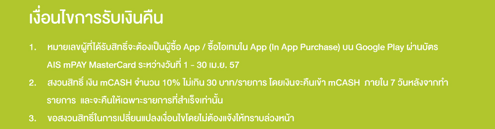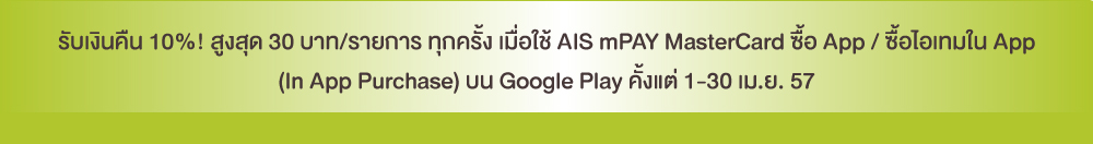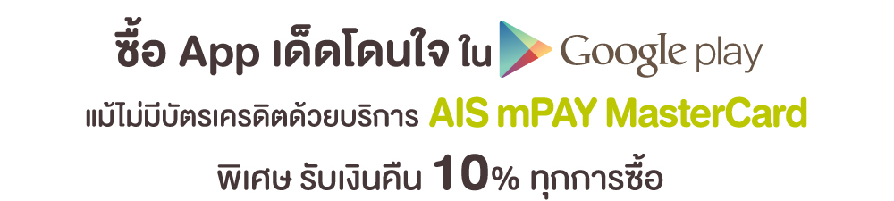 [AIS] พิเศษ!!! ซื้อ app เด็ดโดนใจใน Google play ด้วย Ais mPay MasterCard รับเงินคืน 10% ทุกการซื้อ