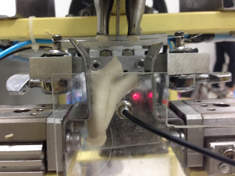 แป้งมันไหลลงมาตามทางพอถึงตอนที่จะประกบเข้าหากันแป้งดันติดตัวประกบไม่ยอมร่วงลงมา