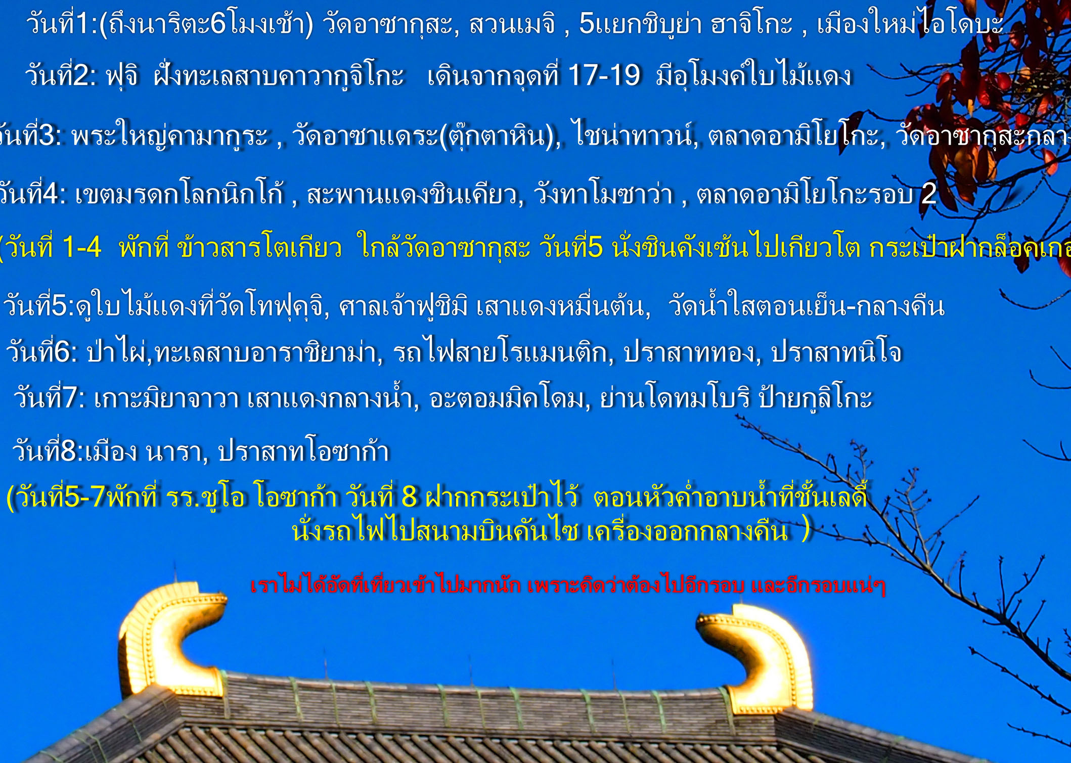วันที่ 1 พักที่ โอซาก้า ----วัด Todenji ที่ Nara --->เที่ยวปราสาทฮิเมจิ ---> สะพานแขวนโกเบ----> อ่าวโกเบ อยู่จนถึงดึก และกลับมานอนโอซาก้า วันที่ 2 ออกเดินทางไปเกียวโต โดยเริ่มที่ Arashiyama ก