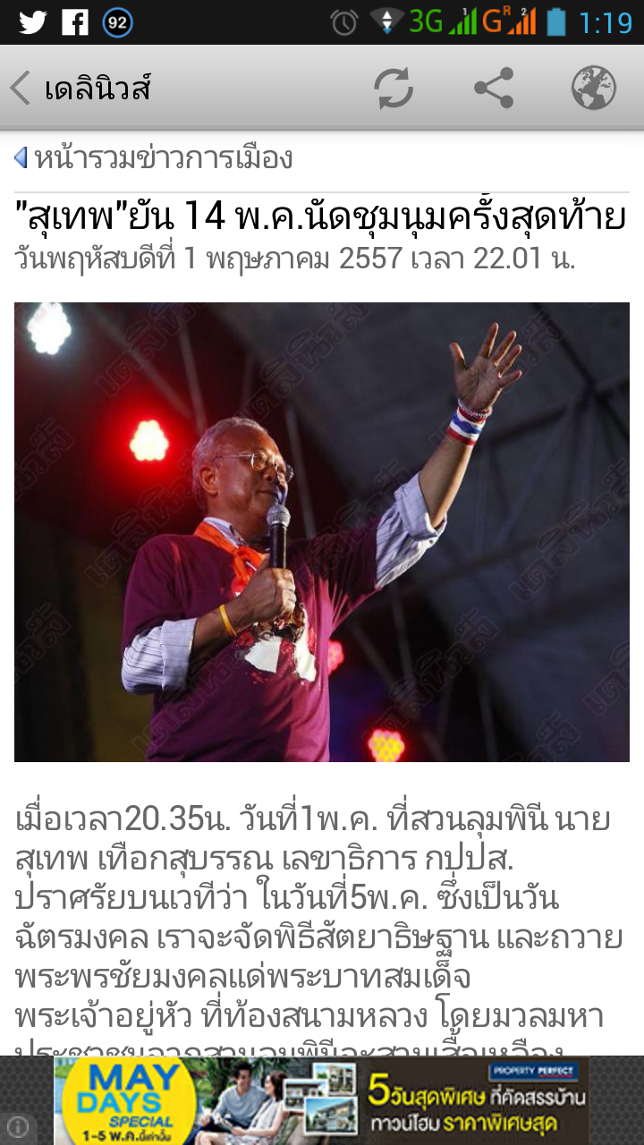 นายสุเทพ กล่าวต่อว่า จากนั้นวันที่6พ.ค.ให้มวลชนได้พักผ่อน1วัน โดยวันที่7-9พ.ค. กปปส.จะเดินเชิญชวนพี่น้องประชาชนทุกสาขาอาชีพร่วมชุมนุมครั้งใหญ่ และในช่วงค่ำวันที่13พ.ค.ซึ่งเป็นวิสาขบูชาจะมีการทำบุญครั้งใหญ่ถือเป็นการทำบุญประเทศ ให้สิ่งดีงามเกิดขึ้นในประเทศไทย และวันที่14พ.ค. เวลา10.00น. จะเป็นวันชุมนุมใหญ่เรียกคืนอำนาจอธิปไตย ขอให้พี่น้องเตรียมความพร้อมไว้อาจอยู่หลายวัน แต่คำว่าหลายวัน คือ3-4วันไม่มากกว่านั้น และการชุมนุมครั้งนี้จะเป็นชุมนุมครั้งสุดท้าย ยืนยันไม่นัดอีกแล้ว นัดนี้จะเป็นนัดเดียวเท่านั้น รู้แพ้รู้ชนะ และขอยืนยันว่าเป้าหมายของเราคือปฏิรูปก่อนเลือกตั้งเท่านั้น ทั้งนี้ขอร้องอย่าได้ตำหนิติเตียน ขอให้นึกย้อนถึงอดีตที่ผ่านมา และย้อนหลังสิบปีว่าประเทศเป็นอย่างไร