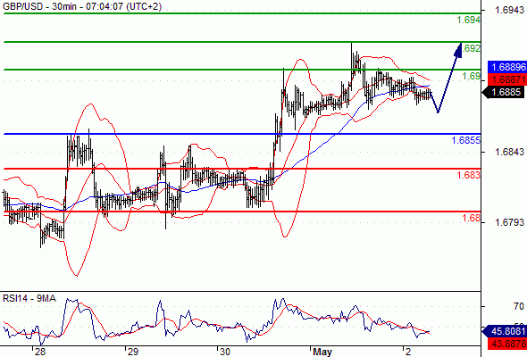 Our preference: Long positions above 1.6855 with targets @ 1.69 & 1.692 in extension.