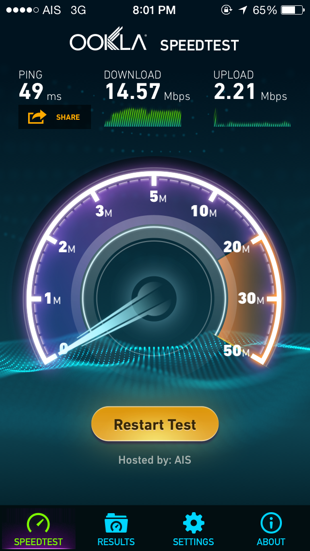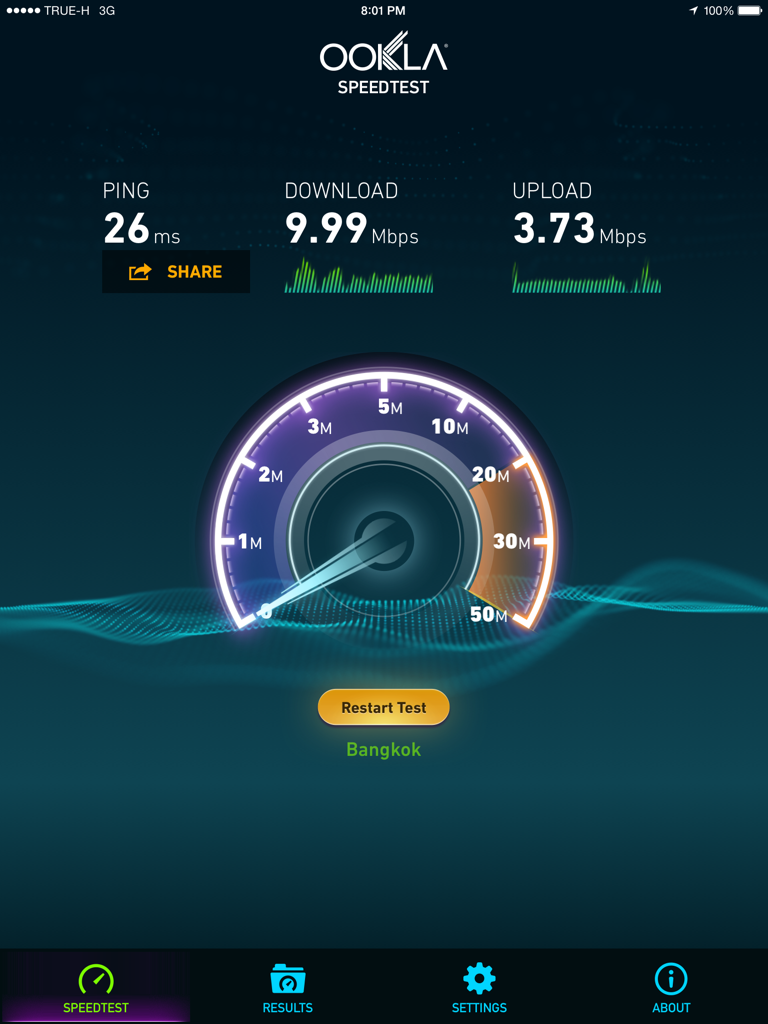 เกริ่นก่อนนะครับ ผมเป็นลูกค้า AIS ทดสอบความเร็วอยู่ในช่วง 40-60 Mbps ตั้งแต่แรกจนถึงปัจจุบัน ซึ่งผมก็พอใจกับความเร็วพอประมาณ แต่เมื่อวาน ผมลองเอา sim ของทรู ที่แถมจากแพค True Online Smart Choice มาลอ