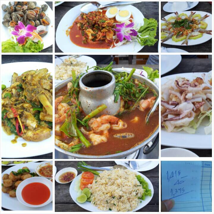 สั่งมา8อย่าง กำลังสั่งเพิ่มพี่พนักงานต้อนรับเบรกไว้ น้องค่อยๆสั่งมั้ยคะ พี่ทวนนะนี่8อย่างแล้วนะ พี่กลัวทานไม่หมด ตอนหิวๆสั่งมาตอนกินเริ่มอิ่มเริ่มเกี่ยงกัน เออมีงี้ด้วยเว้ย ดีว่ะ เดี๋ยวค่อสั่งอีกรอบเนอะ พี่เขาบอก ดีนะที่เขาเบรกไว้ แต่ละจานก็ใหญ่เยอะๆทั้งนั้น มีข้าวผัดปู กุ้งแช่น้ำปลา เอ็นหอยทอดกระเทียม ปลาฉลาดผัดฉ่า หอยแครงลวก ปลาหมึกย่าง ย้ำถั่วพลู แกงส้มชำอมไข่ กินไปครึ่งทางจุกค่ะ เลยพยายามกินให้หมด อาหารสด กุ้งตัวใหญ่เต็มปากเต็มคำ หอยแครงลวกพอกรุบๆ ผัดฉ่าปลาฉลาด เป็นฉลาดตัวเล็กๆที่เขาเลี้ยงในบ่อ อร่อยอ่ะชอบ เอ็นหอยก็ใหญ่มากสดหวาน ชอบอ่ะ ชอบมาก
