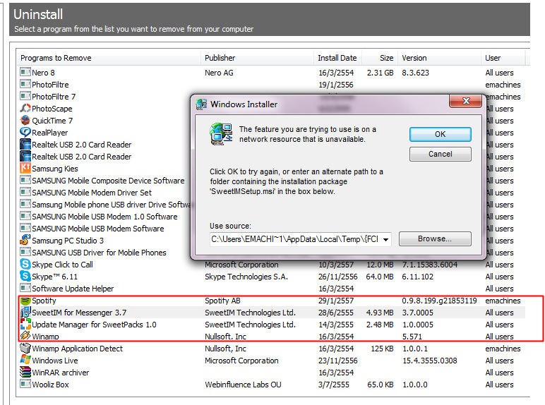โปรแกรมที่พยายามลบค่ะ มันซ่อนไว้หาไม่เจอ ทั้ง chram IE หมาไฟ คือลบออกจากทาร์บาร์ได้ แต่ถอนการติดตั้งไม่ได้ทั้งสองโปรแกรมที่วงแดงไว้ค่ะ โปรแกรม sweet it ค่ะ