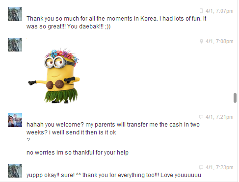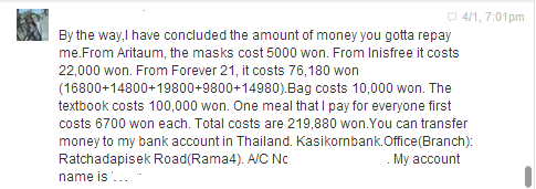 ส่วนรูปข้างล่างนี้ เป็นรูปหลักฐานว่าเค้าติดเงินเรา และจะคืนเรา โดยคุยกับนางทางเฟสบุ๊คหลังจากที่เรากลับมาจากเกาหลีแล้ว