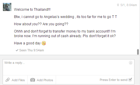 แต่ว่าก็ไม่เคยได้เงินคืนซักที นางอ้างว่า พ่อแม่กำลังจะส่งเงินมาให้อีกสองอาทิตย์ เดี๋ยวนางขอเบอร์บัญชี แล้วจะโอนให้แน่นอน