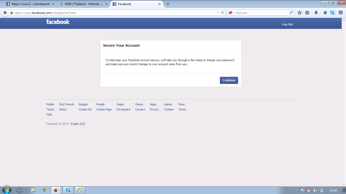 คือ ตอนแรกที่ทำอยากจะเปลี่ยนชื่อเฟสคะ แล้วมันเต็ม เลยหาตาม internet ดู เข้าบอกให้เข้าไป setting แล้วก็กดตรงที่บอกว่าโดนแฮก จากนั้นก็มาเข้าเฟสปกติ ให้ใส่พาสเวิร์ดใหม่ แล้วก็ขึ้นหน้าต่างมาตามรูป
