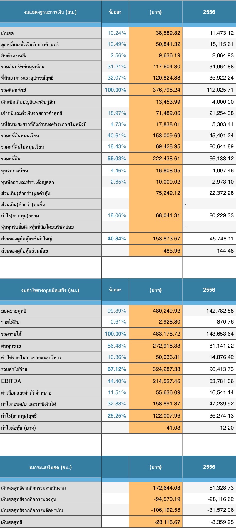 จากนั้นผมจะนำสัดส่วนการถือหุ้นของตนเองมาคิดเป็นงบการเงินของตนเองดังรูป โดยการนำจำนวนหุ้นที่เราถือมาหารด้วยจำนวนหุ้นทั้งหมด ค่าที่เราได้จะเป็นสัดส่วนในการถือหุ้นในบริษัทของเรา โดยในที่นี้สัดส่วนการถือหุ้นของผมในบริษัท ADVANC จะเท่ากับ 0.00034% (ภูมิใจจัง) จากนั้นก็เอาสัดส่วนนี้มาคูณกับข้อมูลในงบการเงินของบริษัท