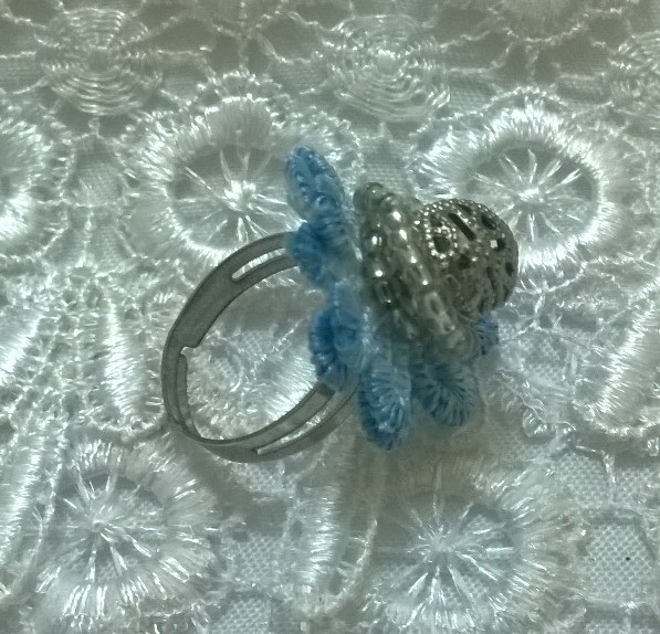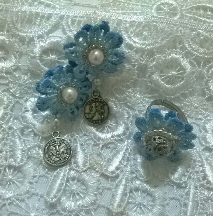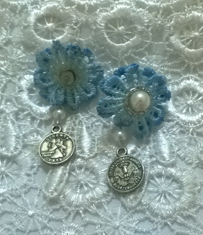 เอาผ้าลูกไม้+สีฟ้า+ห้อยเหรียญสไตล์วินเทจนิด และตัวดอกไม้ก็ นิดนิด^^
