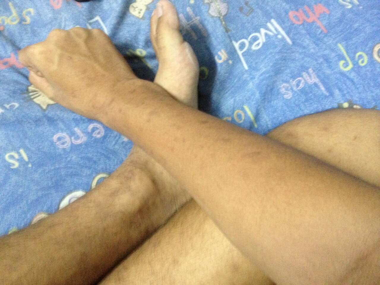 ผมมีอาการน้ำเหลืองไม่ดี(ไม่รู้ว่าเรียกว่ายังงี้รึเปล่า)แต่ผมไม่มีอาการหรือโรคทางผิวหนังใดๆทั้งสิ้น และตอนเด็กๆผมเป็นเด็กที่ซุกซนมากๆอยู่นิ่งไม่ได้ไฮเปอร์ก็ไม่ผิดนัก และตอนนั้นมันคันมากโดนยุงกัด,โดนฝุ่นเล็กๆน้อยๆ,ไหมหรือขนต่างๆแค่นิดเดียวก็คันหูดับตับไหม้ซะแล้ว ด้วยต่อนั้นผมเป็นเด็กที่ไม่ค่อยมีความอดทนผมก็เกาๆๆๆ แม่ห้ามก็ไม่ฟัง เกาจนกว่าจะหายคัน มันก็เลยเป็นแบบนี้บวกกับผมที่เป็นโรคภูมิแพ้ด้วยรึเปล่าก็ไม่ทราบ ทุกวันนี้ก็ยังมีคันอยู่ครับแต่นิดๆหน่อยๆแผลใหม่เกิดขึ้นมาบ้างเล็กน้อย อีกอย่างคือมันจะชอบมีแผลใหม่เกิดขึ้นมาโดยที่ผมไม่รู้ว่ามันมายังไง ลักษณะเหมือนแผลถลอก อีกอย่าที่ผมกลุ่มใจสุดๆคือตอนเด็กผมเป็นเด็กผิวขาวก็คือคนผิวขาวเนี่ยแหละครับแต่ที่ผมผิวคล้ำ+ผิวสองสีมันมีที่มาครับ ทุกๆซัมเมอร์พอผมจะพาไปฟาร์มปลาของแกอยู่ที่อยุธยา ผมไปใช้ชีวิตอยู่ที่ตลอด3เดือน (กลับเสาร์อาทิตย์) ผมจะต้องออกไปช่วยพ่อประจำแล้วแดดที่นั่นมันแรงมาก บวกกับผมที่ไม่ค่อยดูแลเนื้อดูแลตัวในตอนนั้นทำผมเป็นเด็กผิวคล้ำไปเลยคงจะบวกกับการที่ผมไปว่ายน้ำอยู่ช่วงหนึ่งแล้วมันก็ดำเพราะคลอรีน(สระที่ผมไปมันสกปรกมาก แนะนำอยากไปเลยครับ ไม่ขอเอ่ยชื่อแต่อยู่แถวราชดำเนิน-นางเลิ้งเป็นสโมสรของสถานที่ราชการแห่งหนึ่ง)