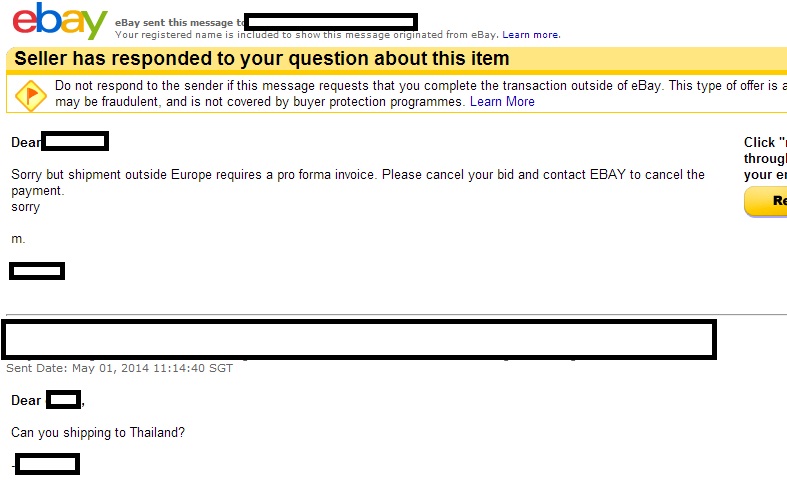 ..ต่อมาผมบิดรายการนี้ครับ และผมชนะ ซึ่งเค้าแจ้งว่าจะเช็คค่าส่งให้ และจะแจ้งผมอีกครั้ง แต่เมื่อเค้าเช็คแล้วเค้ากลับบอกว่าไม่สามารถส่งของมาได้ครับ เค้าบอกว่าต้องมี pro forma invoice ผมก็ไม่ทราบว่ามันคืออะไร เค้าส่งมาแบบนี้ครับ