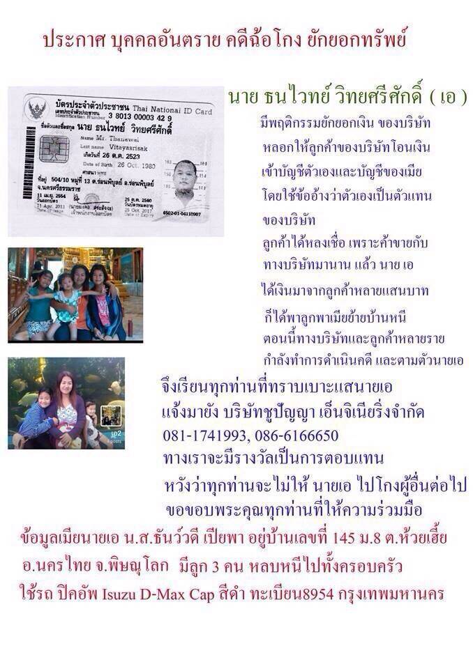 พอดีเราโดนคนยักยอกเงินไปจำนวน2แสนกว่าเรากำลังไปแจ้งความเรารู้ที่อยู่ชื่อคนที่โอนเงินให้เพราะทำธุรกิจร่วมกันถ้าใครเจอแจ้งเราจะมีรางวัลให้ขอบคุณค่ะ