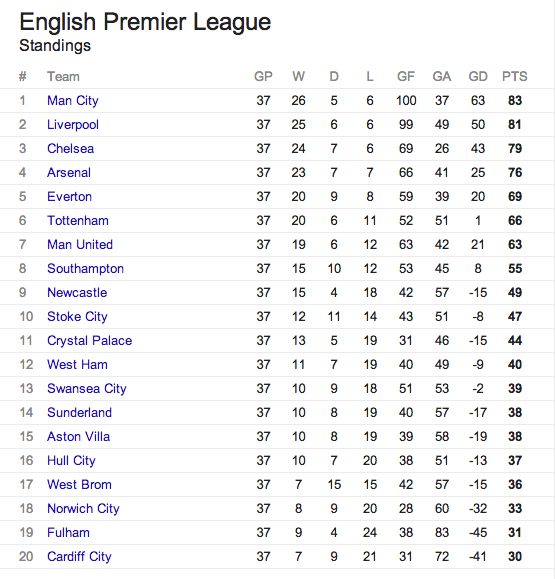 ### การแข่งขันฟุตบอล พรีเมียร์ ลีก ผ่านมาถึงปลายฤดูกาล แล้วก็เริ่มงวดเข้าไปทุกขณะ นี่ก็แข่งขันกันล่วงเลยมาถึงนัดที่ 33 แล้ว (ยกเว้นเรือใบ แข่งไป 31 นัด) ในกลุ่มหัวตารางทีมนำ นำทีมโดยหงส์แดงตะแคงฟ้า ลิ