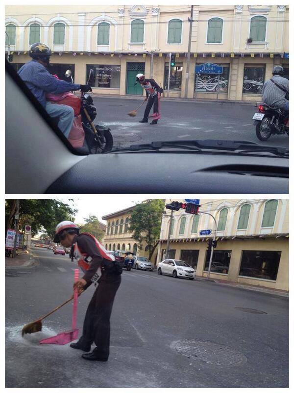 เหตุ (ว.40 ) รถชนกัน ที่สามแยกวรจักร หลังจากร้อยเวรแยกรถทั้งคู่ออกแล้ว ทำให้มีเศษวัสดุ กระจกแตกเต็มพื้นผิวถนน แต่ภาพที่ทุกคนเห็นคือ ตำรวจจราจรประจำแยกวรจักร ได้นำไม้กวาดไปกวาดพื้นผิวถนน ชาวบ้านและผู้ใช้รถต่างปรบมือให้ แต่ เจ้าหน้าที่ตำรวจจราจรนายนี้ หลังจากกวาดถนนเสร็จ ทำหน้า งงๆ เพราะ เขาไม่นึกว่า การกวาดถนนจะเป็นวีรบุรุษของผู้ใช้รถใน กทม. ทำดีต้องชื่นชม