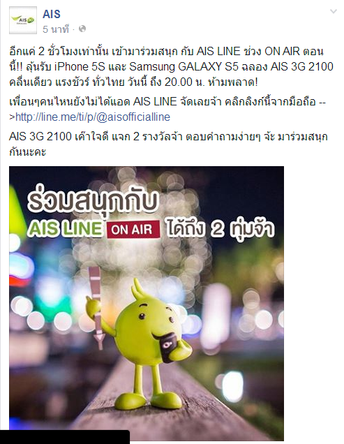 AIS LINE ช่วง ON AIR ตอนนี้!! ลุ้นรับ iPhone 5S และ Samsung GALAXY S5 มีคำถามครับ AIS >?<
