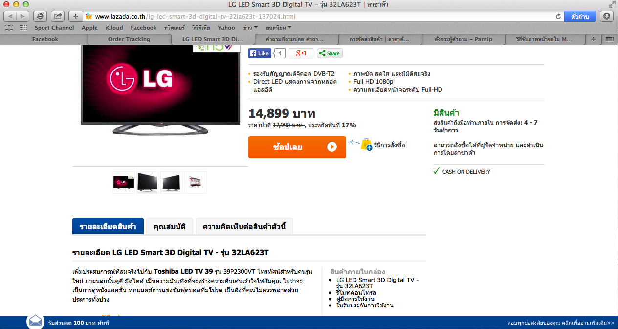 เนื่องจากผมเห็นวาทางลาซาด้ามีทีวี lg smart tv 3d รุ่นหนึ่ง ราคาถูกกว่าร้านค้าที่ผมไปดู เลยเลือกสั่งทีวีรุ่นนี้ไป
