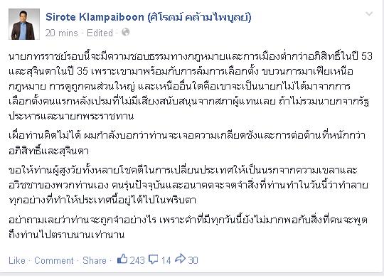ไม่ว่าจะเกิดอะไรขึ้น ยังมีประชาชนคนไทยอีกหลายสิบล้านคน คอยเป็นกำลังใจให้ท่าน ถ้ามันยุ่งยากมาก ก็ยุบสภา แล้วเลือกตั้งใหม่เลย คนที่กลัวมากที่สุดคือพวก สส ฝ่ายค้