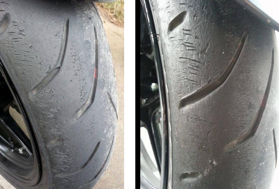 -ผมซื้อรถนินจา1000 มาได้เดือนกว่าๆจากดีลเลอร์ใหญ่เจ้านึงฝั่งธน ตอนนั้นไมค์ผม 750 กิโลผมเจอสภาพยางหน้าแบบนี้ครับ แต่จริงๆมันแตกก่อนนั้นแล้วครับผมเห็นแต่ไม่ได้สังเกตุเท่าไหร่ แตกร้าวเหมือนส้นเท้าแตกทั้งเส้น แตกรอบวงทั้งข้างๆและตรงกลาง เนื้อแข็งมากกดไม่ลงดูเอาละกันว่ามันปกติหรือเปล่า ผมเลยแจ้งไปที่ที่ผมซื้อรถมาก็คือโมโตพระรามห้า